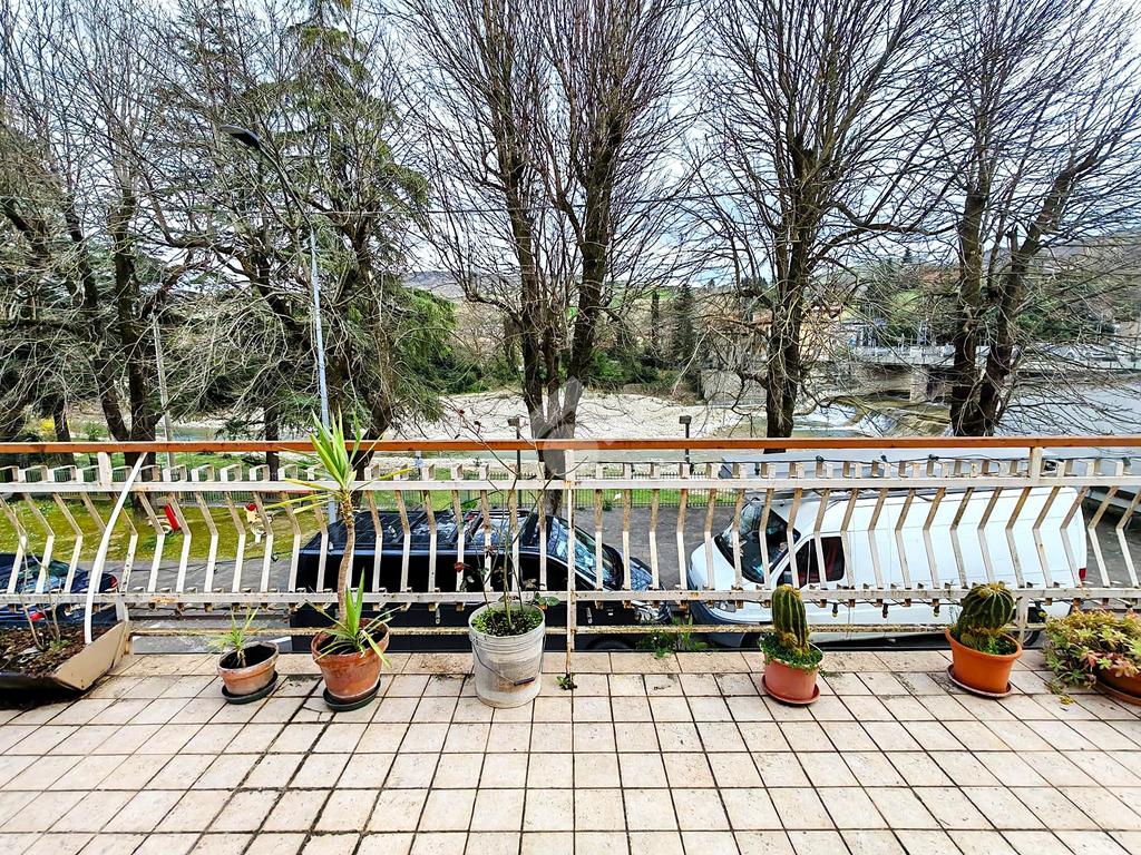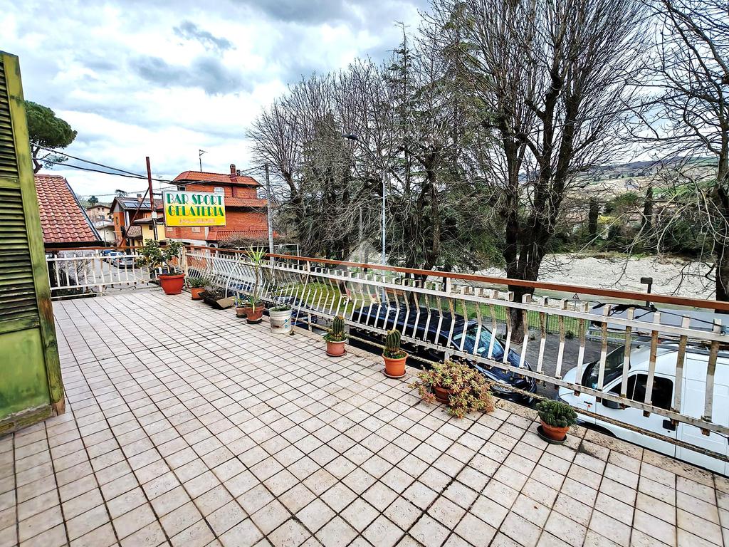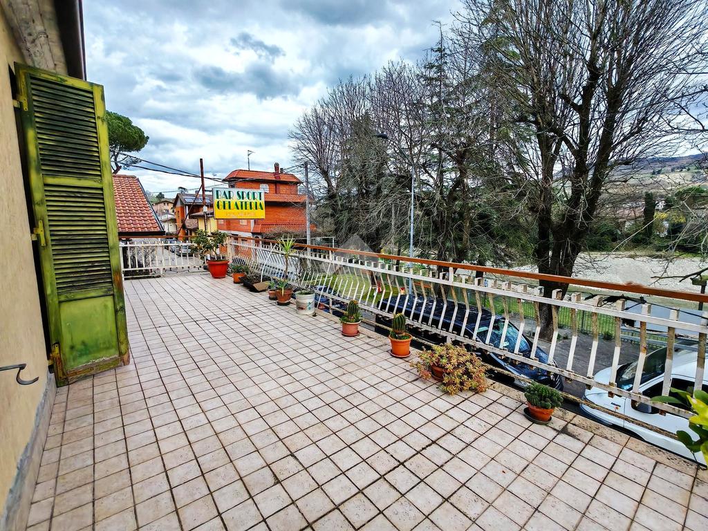 Essa inoltre possiede due ampi terrazzi abitabili: il principale, posto sul fronte dell'abitazione, è pavimentato e si affaccia sul centro, godendo della vista sul Bidente; il secondario sul retro, accessibile dalla cucina, ha la guaina di copertura e può essere personalizzato a proprio piacimento, in modo da creare uno spazio all'aperto polifunzionale e ricercato.