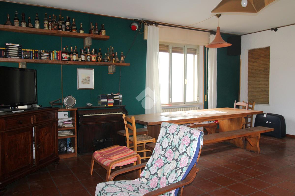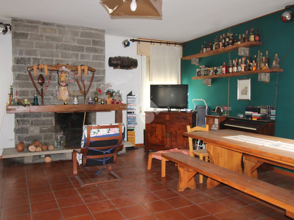 Il primo appartamento ha una zona giorno composta dal salotto con camino, caratterizzata da una pavimentazione in cotto, oltre a una sala pranzo con cucinotto separato; nella zona notte è presente una camera da letto e il bagno finestrato.