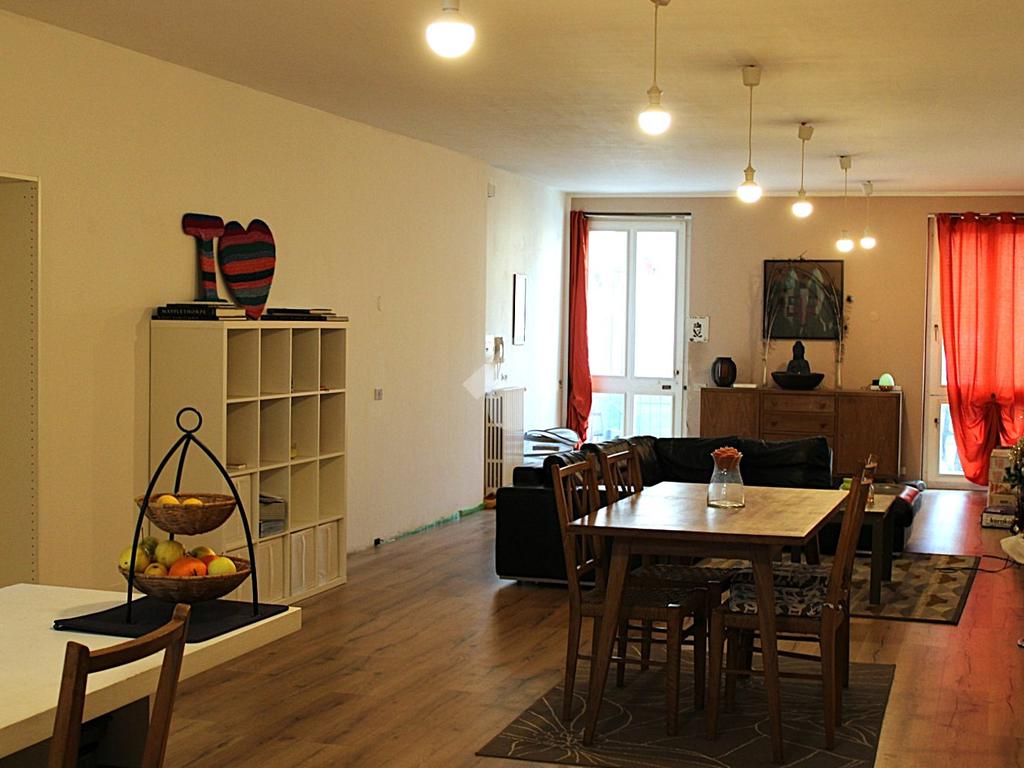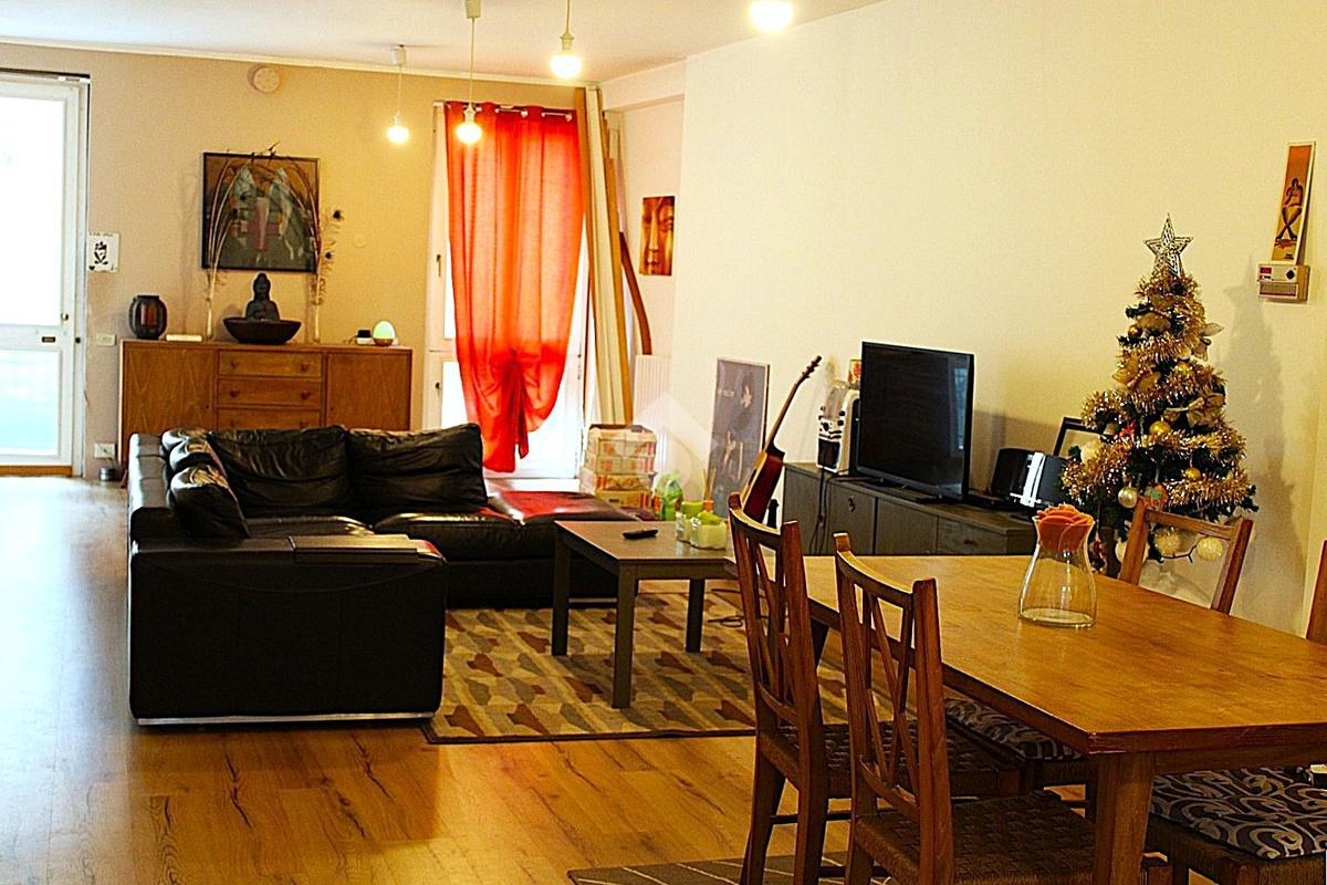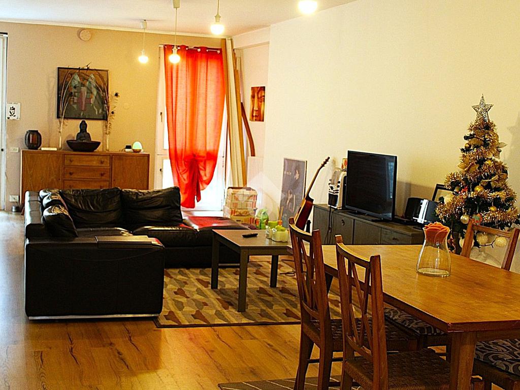Appena entriati troviamo un'accogliente soggiorno con cucina, uno spazio ampio e grazioso: gli ambienti sono luminosi, grazie alla presenza della porta finistre.