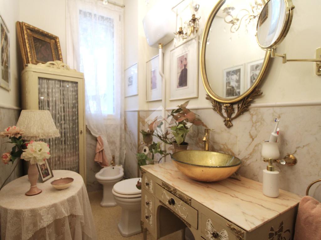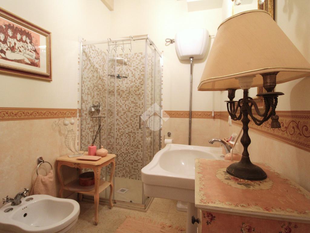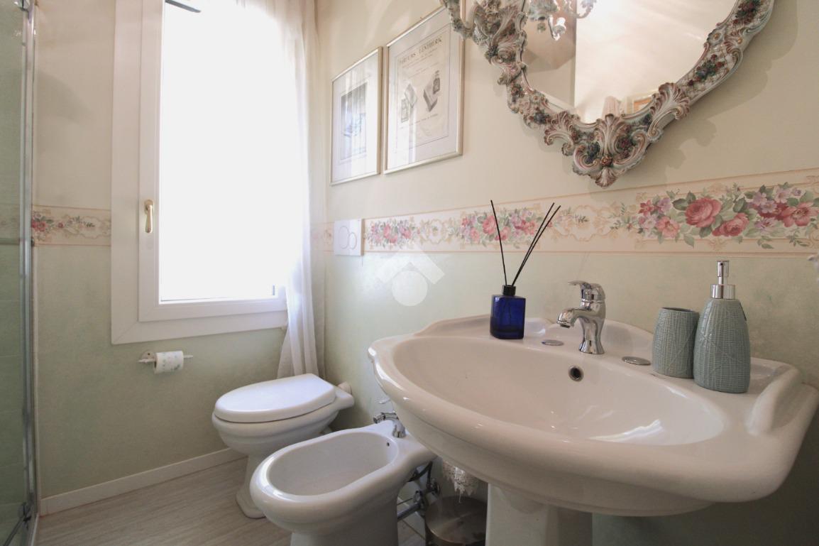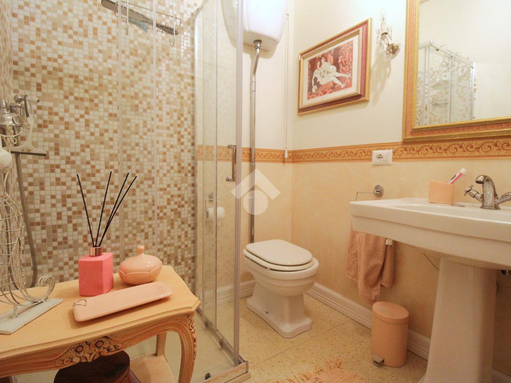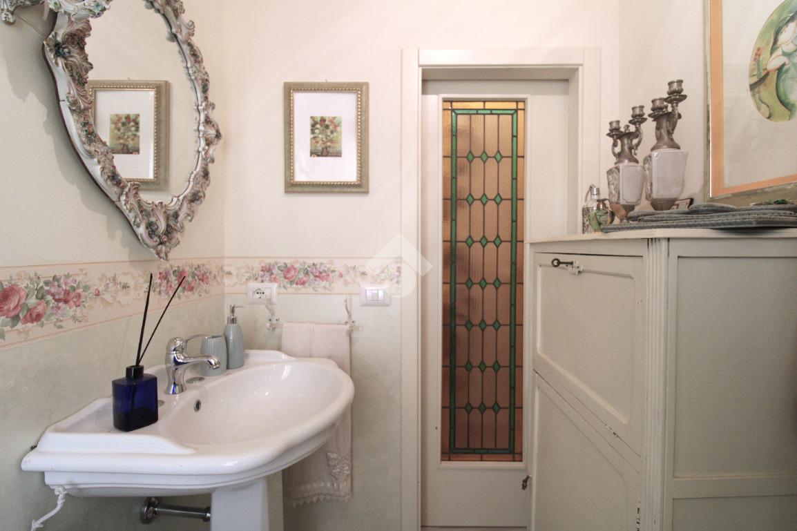 Sul piano c'è il terzo bagno finestrato e dotato di box doccia: è da apprezzare l'attenzione nello scegliere sanitari in stile retrò in ogni servizio, preservando così armonia e carattere nell'abitazione.